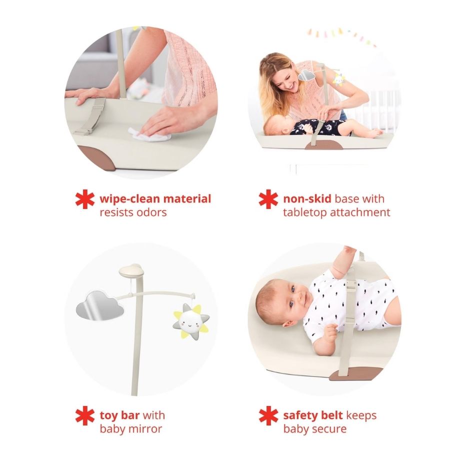 Parenting can be a dirty job, but it doesn't need to be. Our contoured changing pad easily wipes clean, so you're always ready for the next diaper change. Comfortable and cushioned with a tuck-awa...